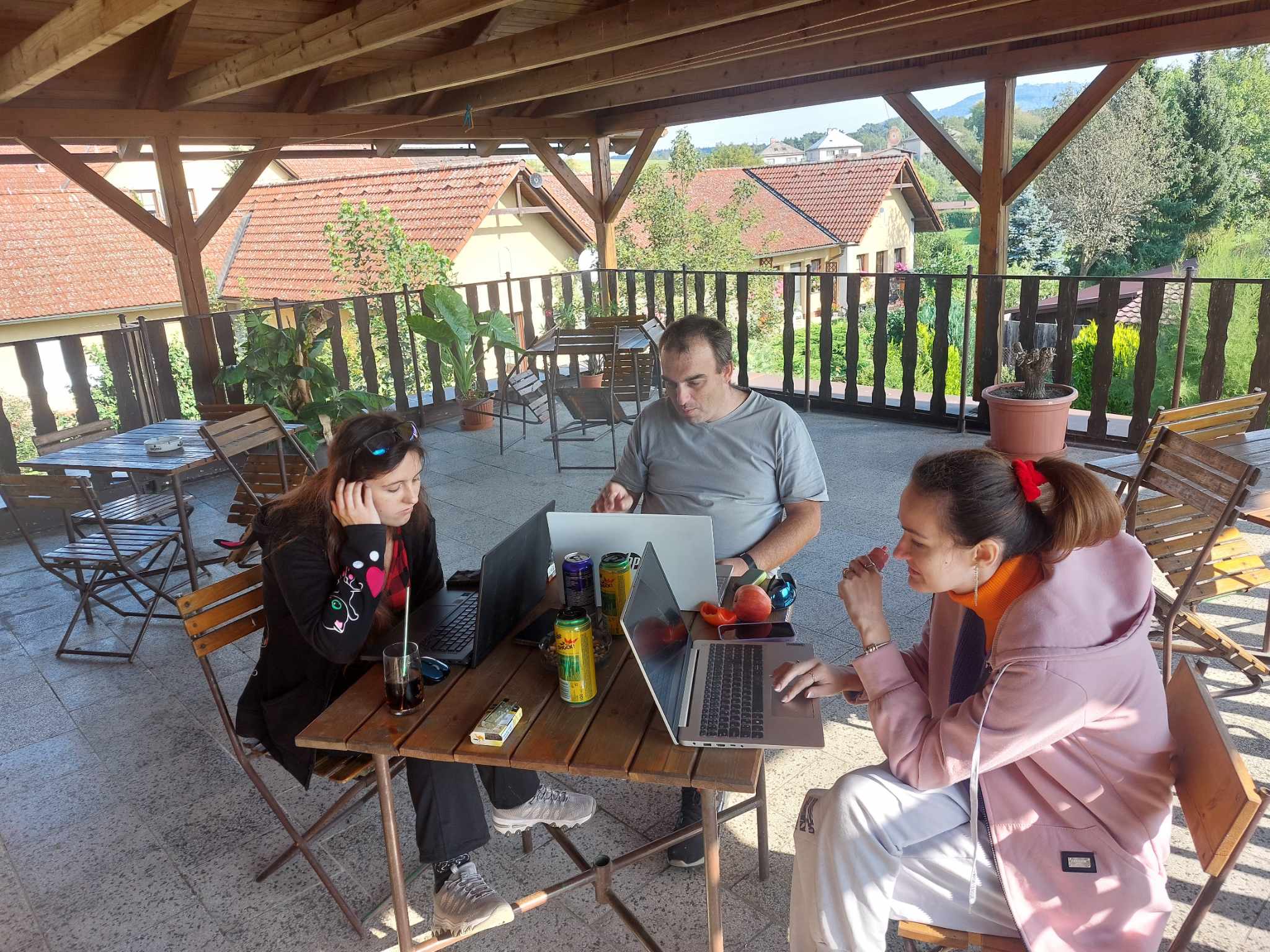 Po snídani proběhla výměna partnerek, kdy redakce komplet odjela do Prahy a druhá půlka zůstala střežit penzion. V Praze jsme vyzvedli nové zásoby jídla a po návratu naše počty rozšířil i Fany. V odpoledních hodinách už čekáme jen Tatmuse a sraz může na plno začít.
