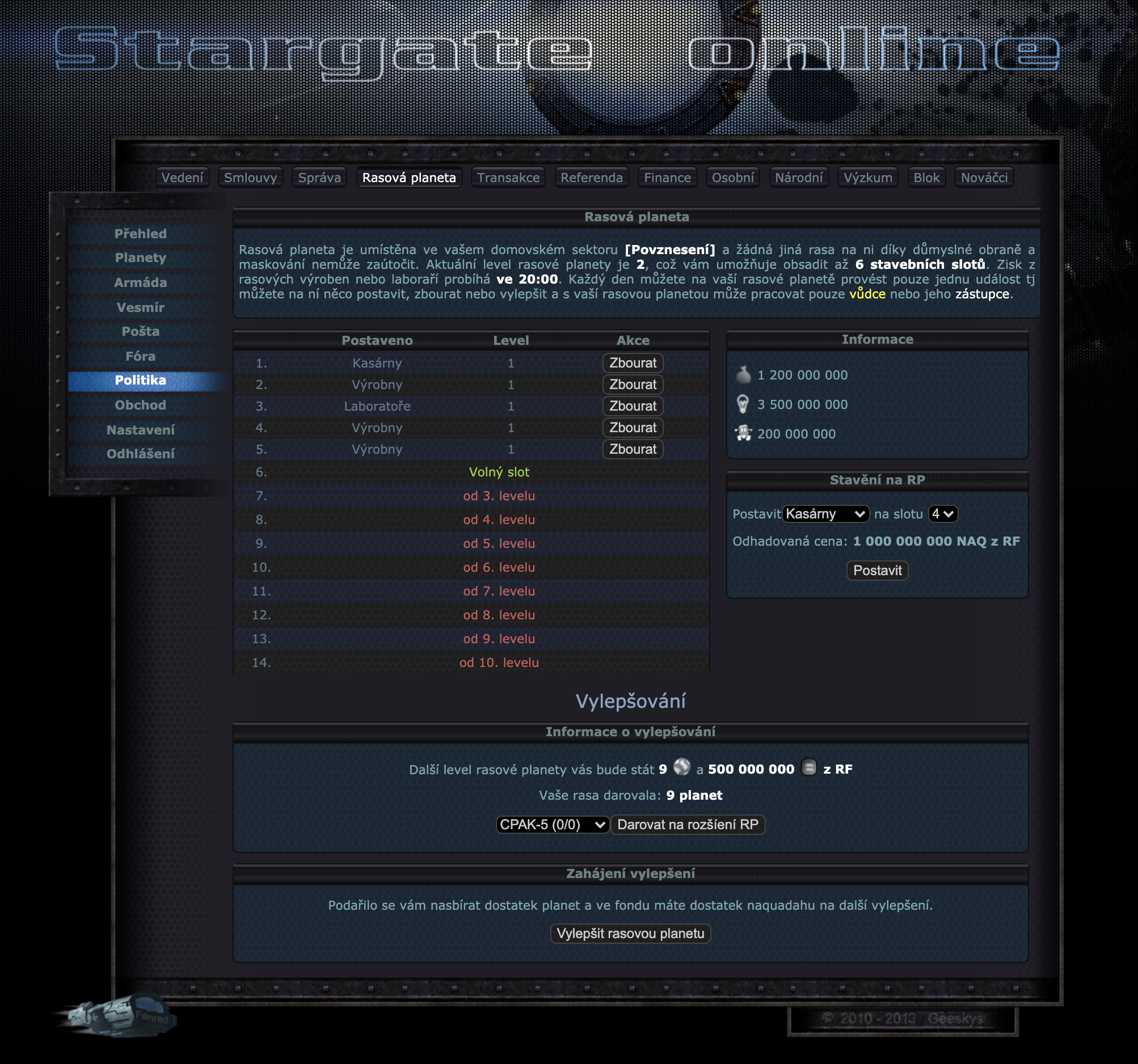 Na závěr článku bych si rád odložil screenshot starých rasových planet tyto rasové planety byly nastavené na 4 pro rasu - mohl je přidělovat vůdce - nešlo na nich nic stavět a mohly mít nějaký drobný bonus. Tato RP přinášela fixní bonus 100 000 000 NAQ za přepočet a jejich obrana byla o 500% vyšší než na normální planetě.